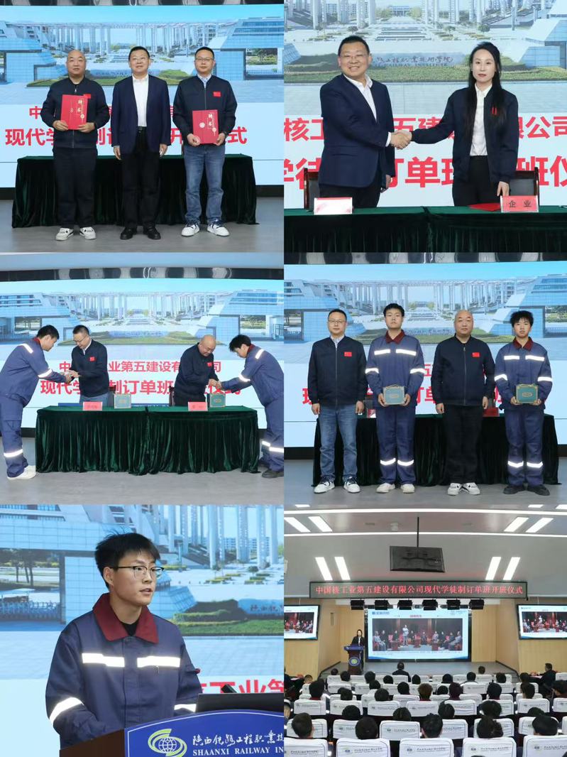 2025年11月3日上午,陕西铁路工程职业技术学院与中国核工业第五建设有限公司在高新校区诚信厅隆重举行现代学徒制订单班开班仪式。校企双方代表及订单班全体学生齐聚一堂,共同见证这一重要时刻。仪式由陕西铁路工程职业技术学院副校长刘明学主持。