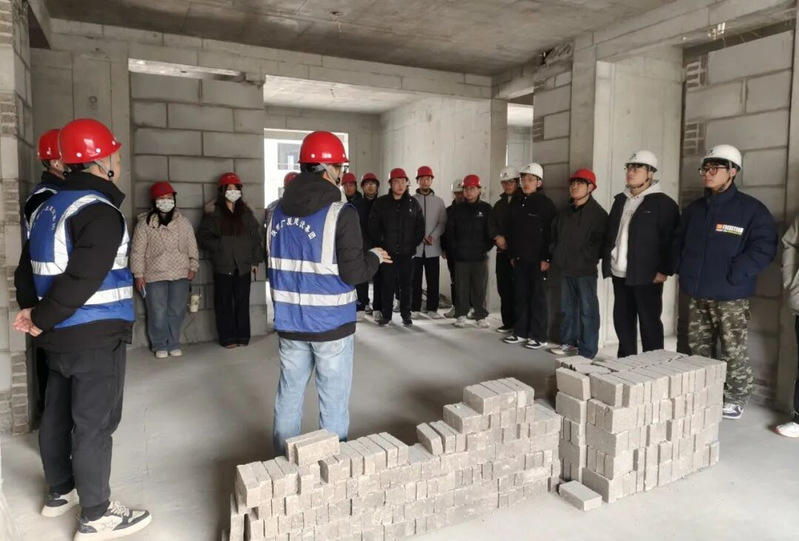 教学分四组进行,每组由专业技术人员指导教学,安全员全程陪同。专业技术人员从图纸设计、二次结构排砖、给排水及电气管线的预留预埋等方面向师生进行讲解,并强调各工序施工标准与质量控制要点,直观地展示了“好房子”背后的精细工艺,学生们驻足观摩,现场互动交流。