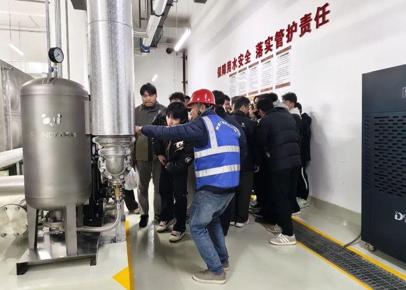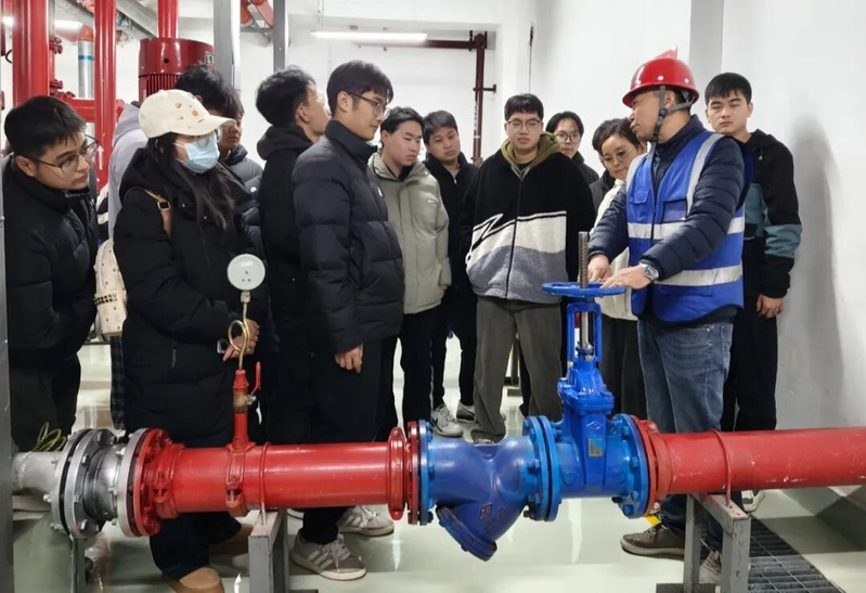 师生们参观了鸿基世业万和府一期设备间,专业技术人员详细讲解了给排水、暖通、消防等隐蔽工程的系统布局,通过实体参观,帮助师生建立起对建筑“内在脉络”的立体认知。整个参观过程节奏紧凑、内容扎实,真正实现了从“纸上谈兵”到“真枪实战”的跨越。